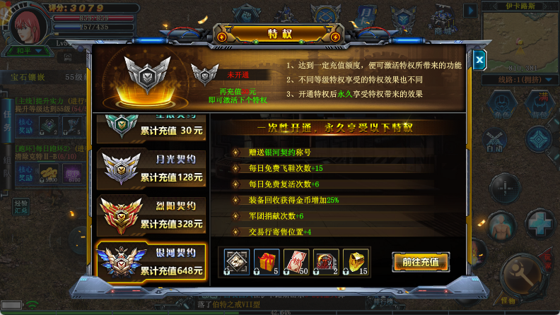 4.【银河契约】:售价 648 元。是最高档的特权契约,拥有杀怪经验 + 10%,使得玩家在杀怪升级过程中获得更多经验,快速提升等级;回收金币 + 25%,能获得更为丰厚的金币收益;还可能包含其他稀有特权和加成,助力玩家在游戏中称霸。